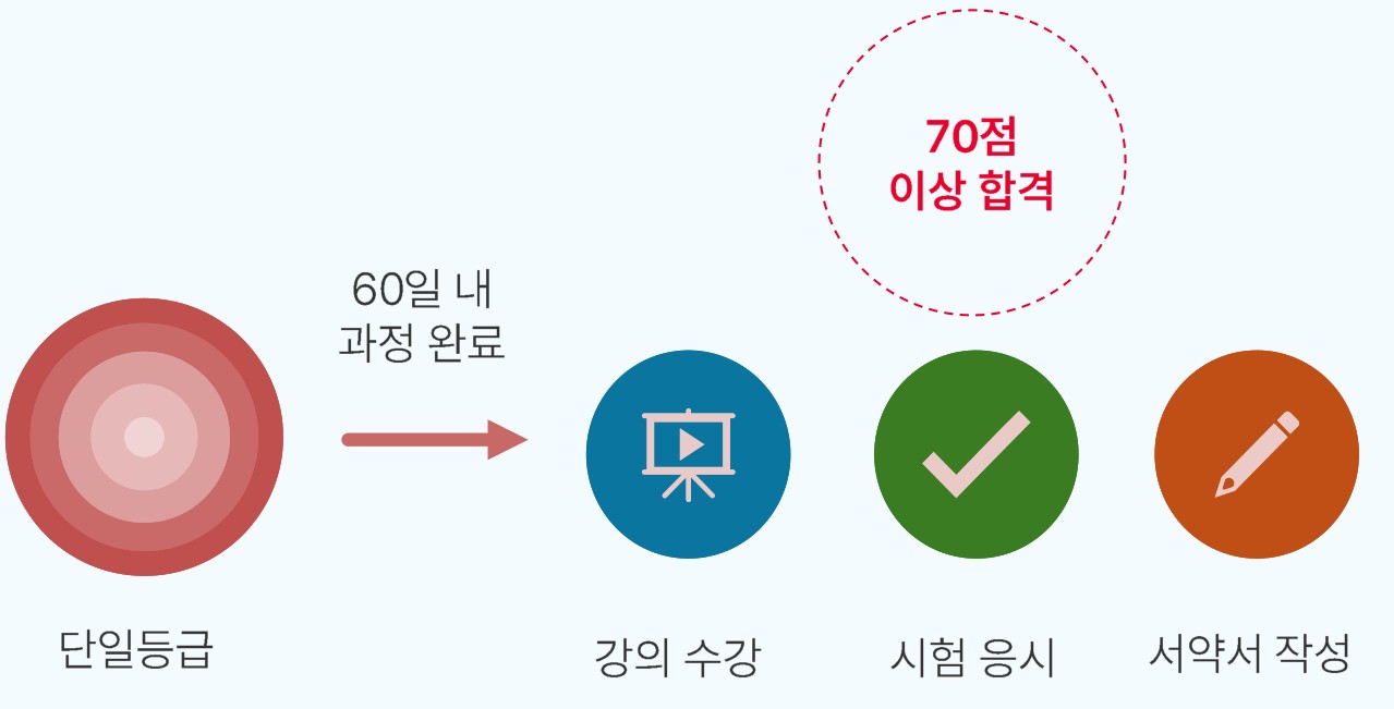 - 사전의무 동영상 100% 수강 및 집합교육 수료자에 한해 시험에 응시 가능합니다.